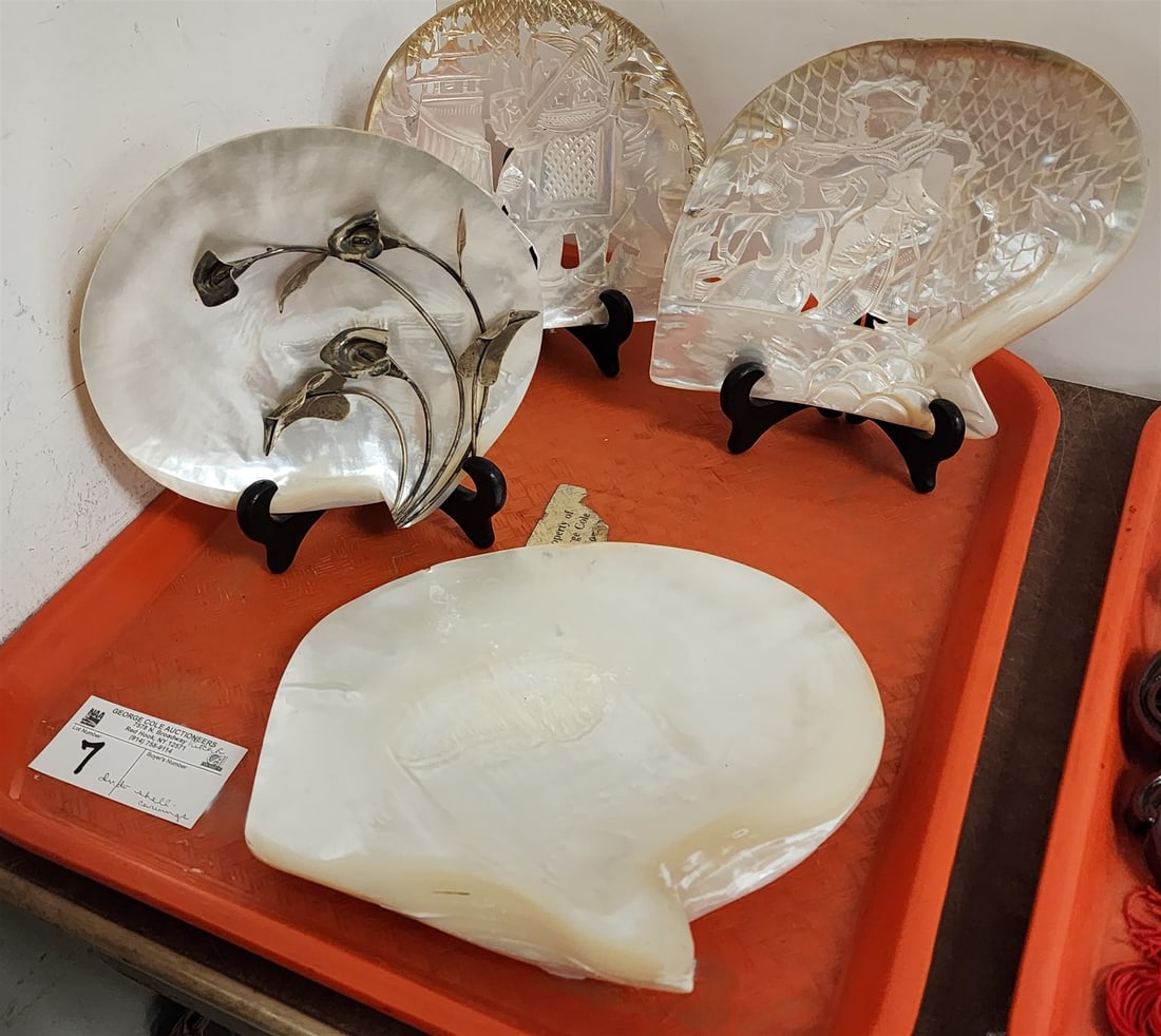 SoldChinese 19C Pierced Carved Shell Calling-Card TrayChinese 19 Century Pierced & Carved Shell Calling-Card Tray with a lacy design of leaves and flowers, polished with flattened base. Height 8 inches (20.3 cm.).See Sold Price