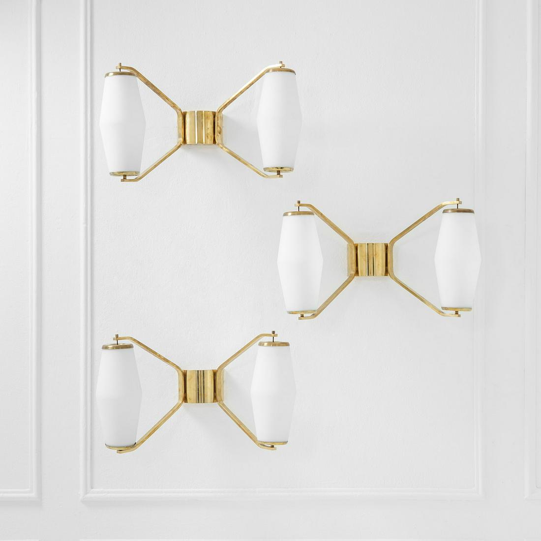 SoldStilnovoTre grandi lampade da parete Vetro opalino satinato, ottone. Prod. Stilnovo, 1950 ca. cm 41x68x34 Decalcomania del produttore.See Sold Price