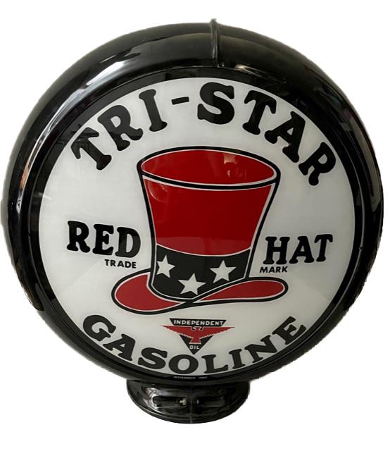 SoldAMERICAN 10 GALLON VISIBLE GAS PUMP RESTORED IN RED HAT GASOLINE.C. 1920's American 10 Gallon Visible Gas Pump showing a full restoration done in Tri-Star Red Hat Gasoline showing black and red paint with Red Hat decals and reproduction Red Hat Gasoline Globe. PumpSee Sold Price