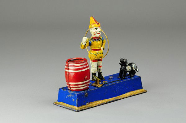 Hubley Mfg. "Trick Dog" mechanical bank, solid base, coin goes is dog's mouth, when lever is releaseHubley Mfg. "Trick Dog" mechanical bank, solid base, coin goes is dog's mouth, when lever is released, the dog jumps through hoop to deposit coin in red barrel, mechanism in working order, wear consis