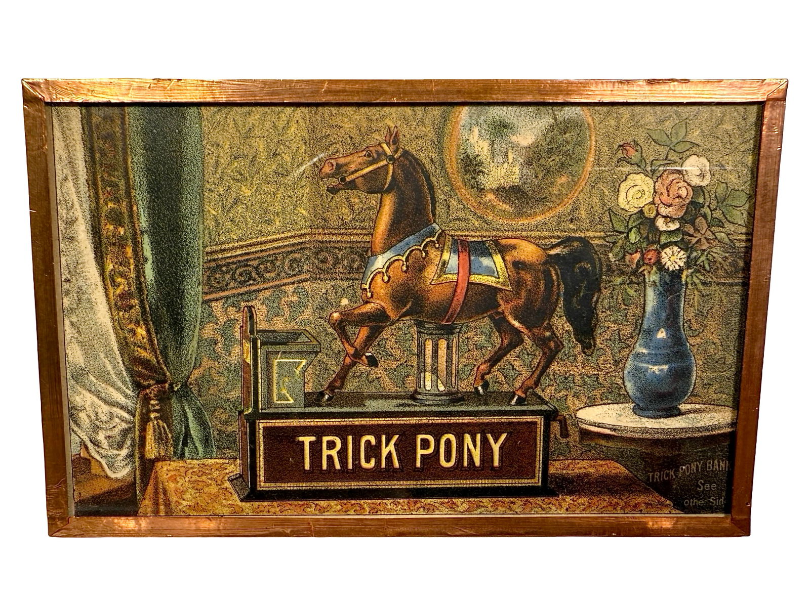 SoldLot - 2 Damaged Color Trade Cards For Trick Pony BankThey come with a frame Origin: Buffalo, NY Manufacturer: Shepard Hardware Material: Paper Period: 1890See Sold Price