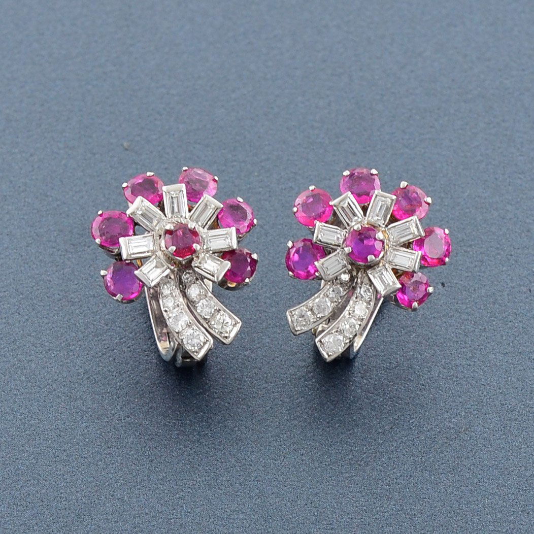 Elegant 18k White Gold Ruby Diamond Floral Clip On Earrings