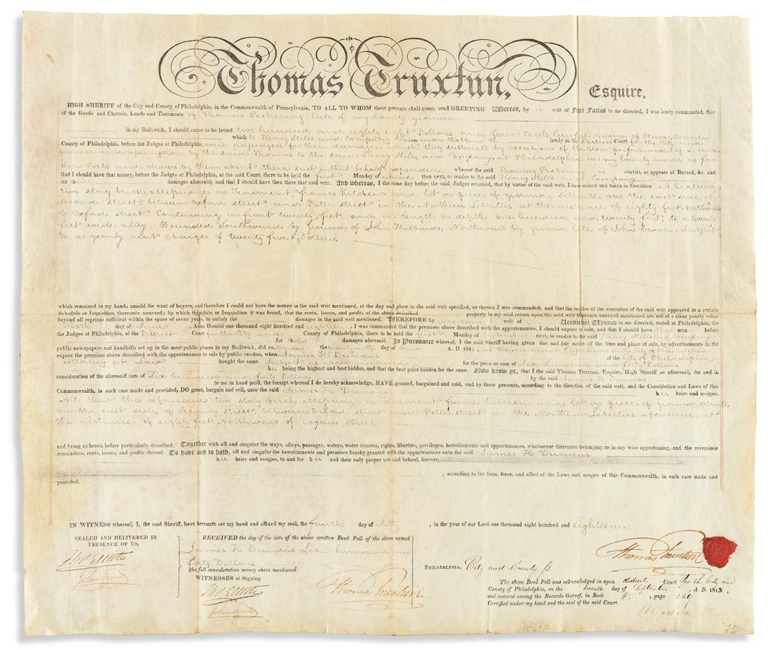Late 18th Century Pennsylvania Colonial Land CaseMar 15, 20261800 Fine New York Bail DocumentADAMS JOHN QUINCY: (1767-1848) Adams appoints Alexander Macomb to the rank of Major General, threeMar 26, 2026William Thornton 1817 Washington DC Capital Architect Signed Manuscript Document Richard Bland LeeMar 29, 20261767 Philadelphia Land Bond Mifflin/Wallis SignatureMar 15, 20261794 Connecticut Recorded Land DeedMar 15, 2026LINCOLN, Thomas (1778-1851). Manuscript marriage bond document signed ("Thomas Lincoln"), KnobMar 26, 20261784 Rhode Island Governor Arthur Fenner Signed DocumentMar 15, 20261797 British Vellum Lease IndentureMar 15, 2026(LAW.) Lawsuit discussing the right of a "colored man" to claim property by settlement.Mar 19, 2026(MILITARY--CIVIL WAR.) Compensation application for soldier in United States Colored Troops.Mar 19, 2026Choctaw Nation Land Record Document, Signed by Orlando Brown, 18502 days Left1781 William Bradford Revolutionary War Pennsylvania DocumentMar 15, 2026(RECONSTRUCTION.) Freedmen's sharecropping contract. Schley County, GA, 1 January 1867Mar 19, 20261728 Colonial Land Promissory Note Early American ManuscriptMar 15, 2026Middlesex County Colonial Massachusetts Bay Deed Recorded 1765Mar 15, 2026