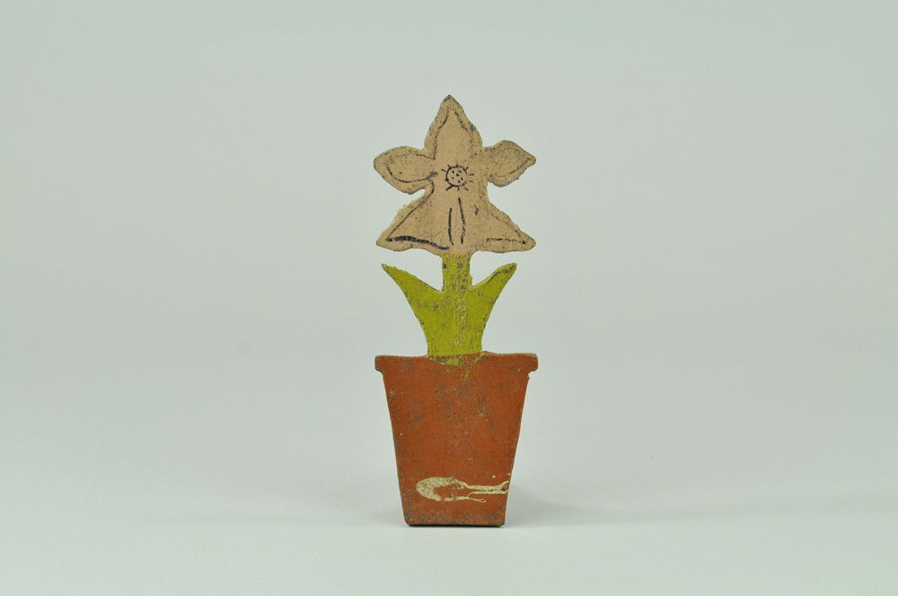 SoldCast Iron Flower Pot DoorstopTitle: Cast Iron Flower Pot Doorstop Date/Period: 1920's Origin: American Dimension: 7" H x 4" W x 1 3/4" D Provenance:Great old paint on this cast iron flower pot / bouquet doorstop Shipping: DomestiSee Sold Price