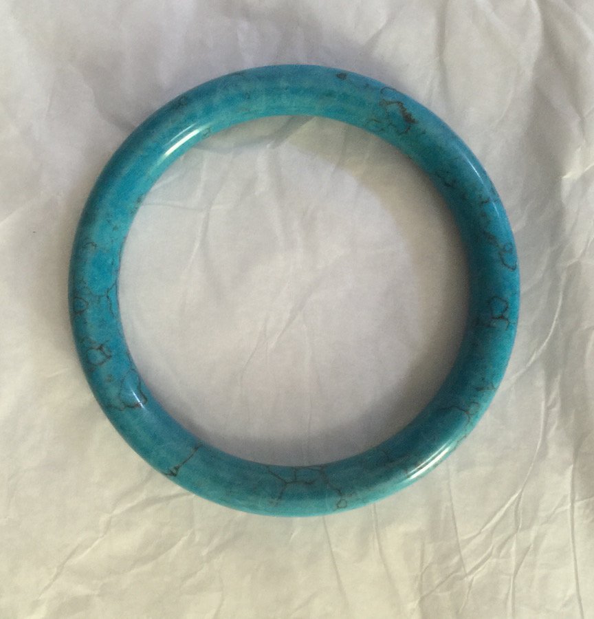 SoldTURQUOISE BANGLEThe turquoise stone originated from Turkey, with light turquoise color mixed with black patches and veins in natural patterns. Diameter: 77.08 mmSee Sold Price