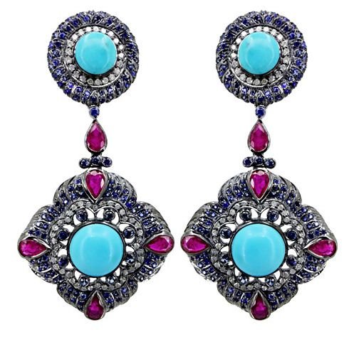 TURQUOISE RUBY AND SAPPHIRE DROP EARRINGS