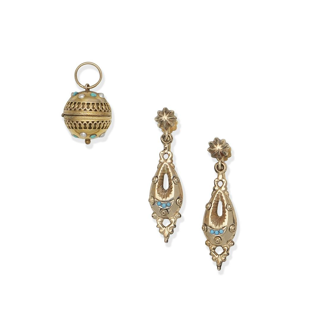 TURQUOISE-SET EARCLIPS AND POMANDER PENDANT (2)