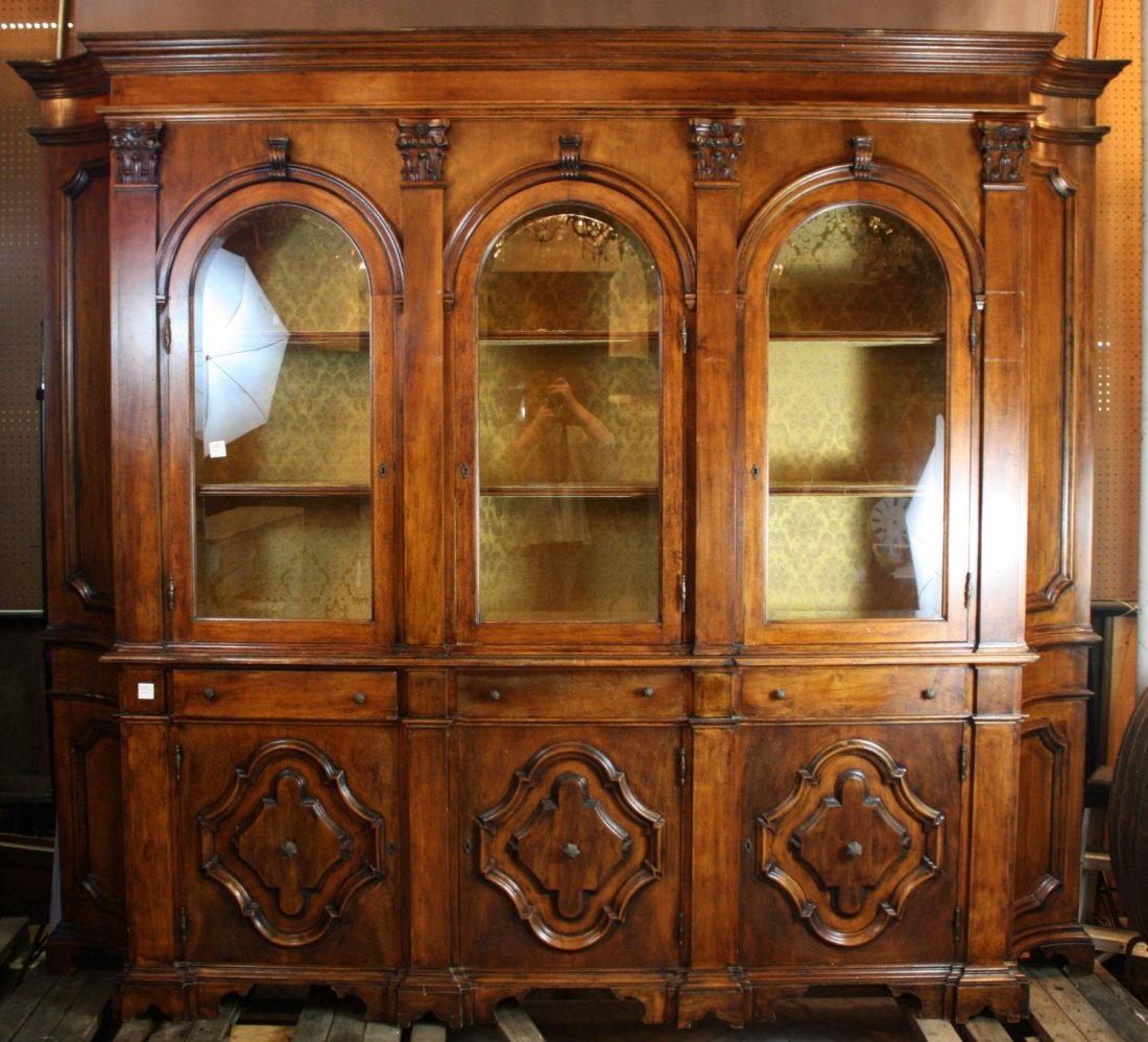 SoldModern Two Piece Lighted 7 Door China Cabinet:Modern Two Piece Lighted 7 Door China Cabinet: Ogee Pediment over 4 Glazed Doors in Set Back Cabinet. Mihrab Shaped Top Windows. 3 Interior Shelves. 2 Side by Side Drawers, One Fitted, over 4 Door BliSee Sold Price