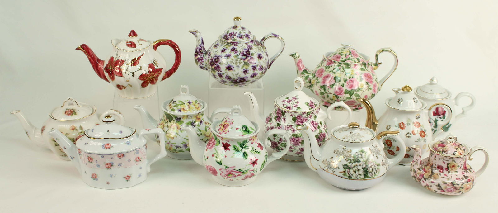 Twelve Porcelain Teapots with Flowers