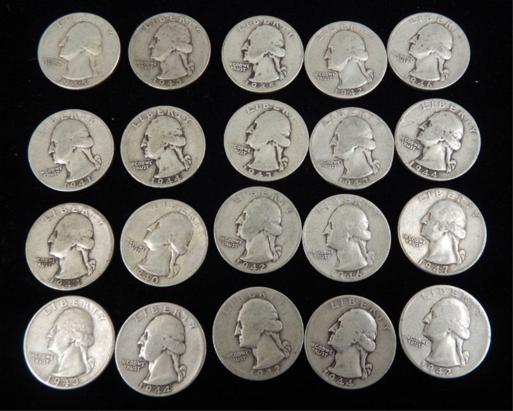 Twenty 1940's silver Washington Quarters