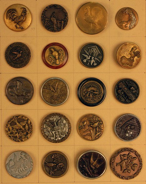 TWENTY BIRD BUTTONS. Mostly large stamped brass, on