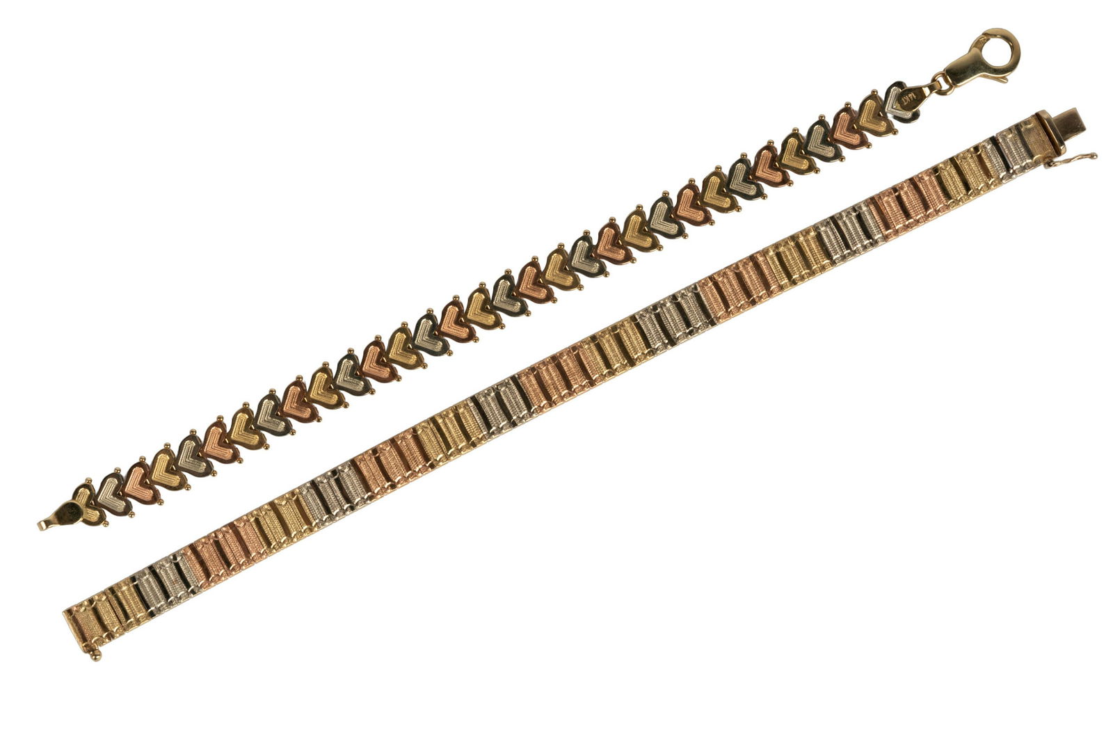 TWO 14 KARAT TRI-COLOR GOLD BRACELETS