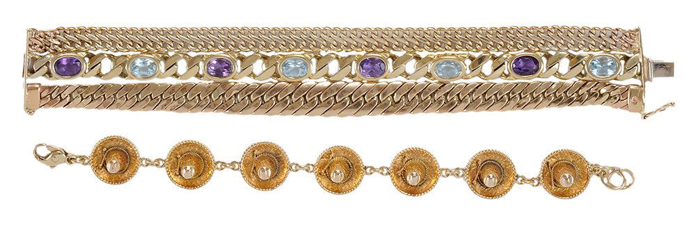 SoldTwo 14 Karat Yellow Gold & Gemstone BraceletsTwo 14 Karat Yellow Gold & Gemstone Bracelets One bracelet is set with emerald cut blue topaz weighing a total of 6.30 carats accented by emerald cut amethyst weighing a total of 12.60 carats, lengthSee Sold Price