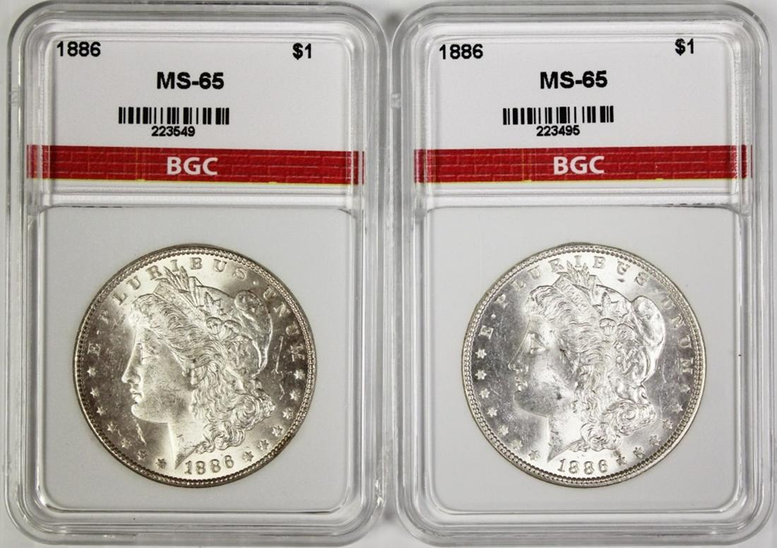 SoldTWO 1886 MORGAN DOLLARS:CCGS GRADED MS66 BLAST WHITE AND BGC GRADED MS65. ESTIMATE: $290-$350See Sold Price