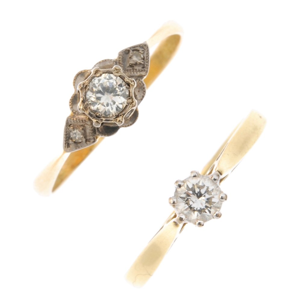 Two 18ct gold diamond single-stone rings. The first