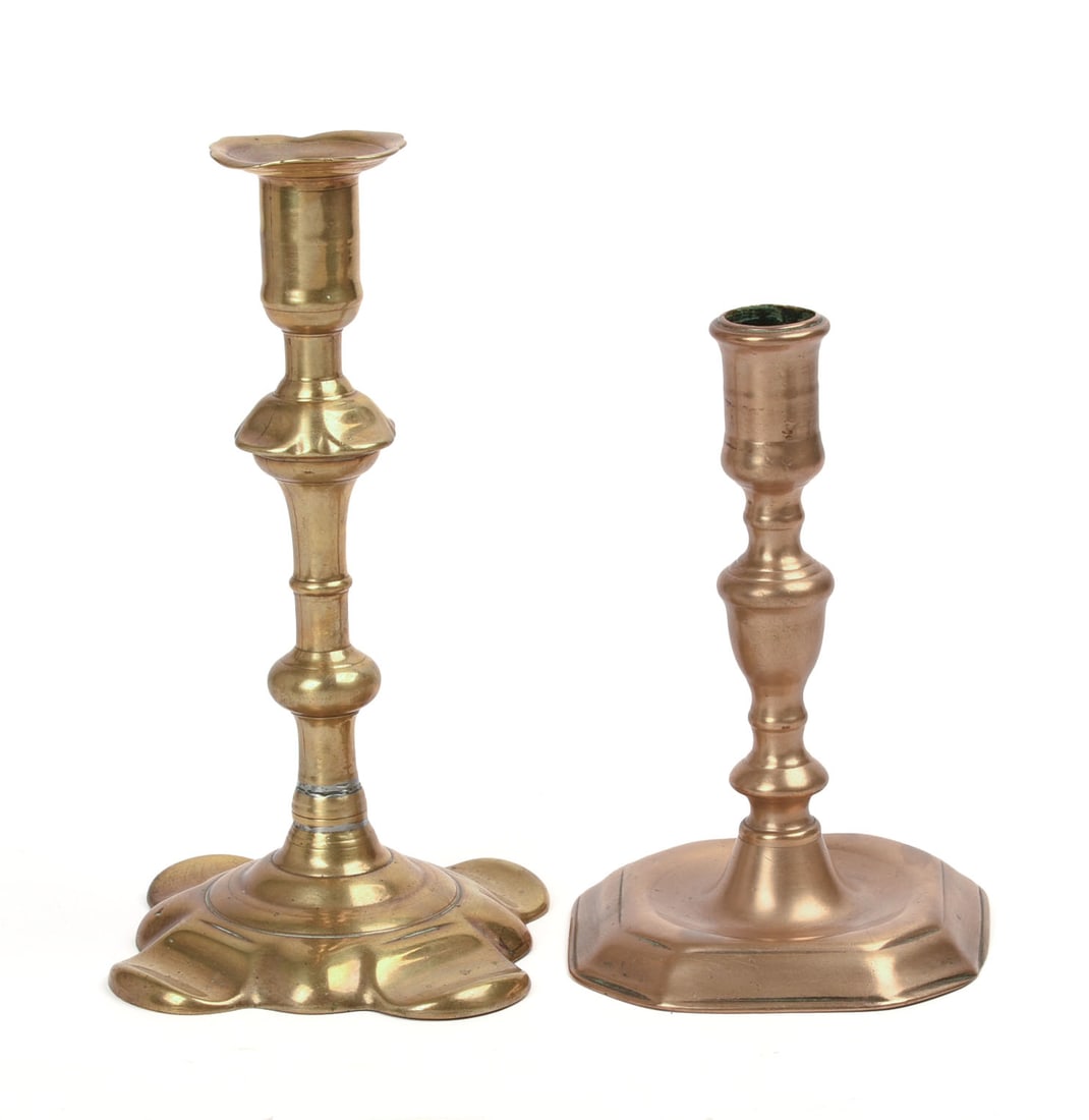 TWO 18TH OR EARLY 19TH CENTURY BRASS CANDLESTICKS.