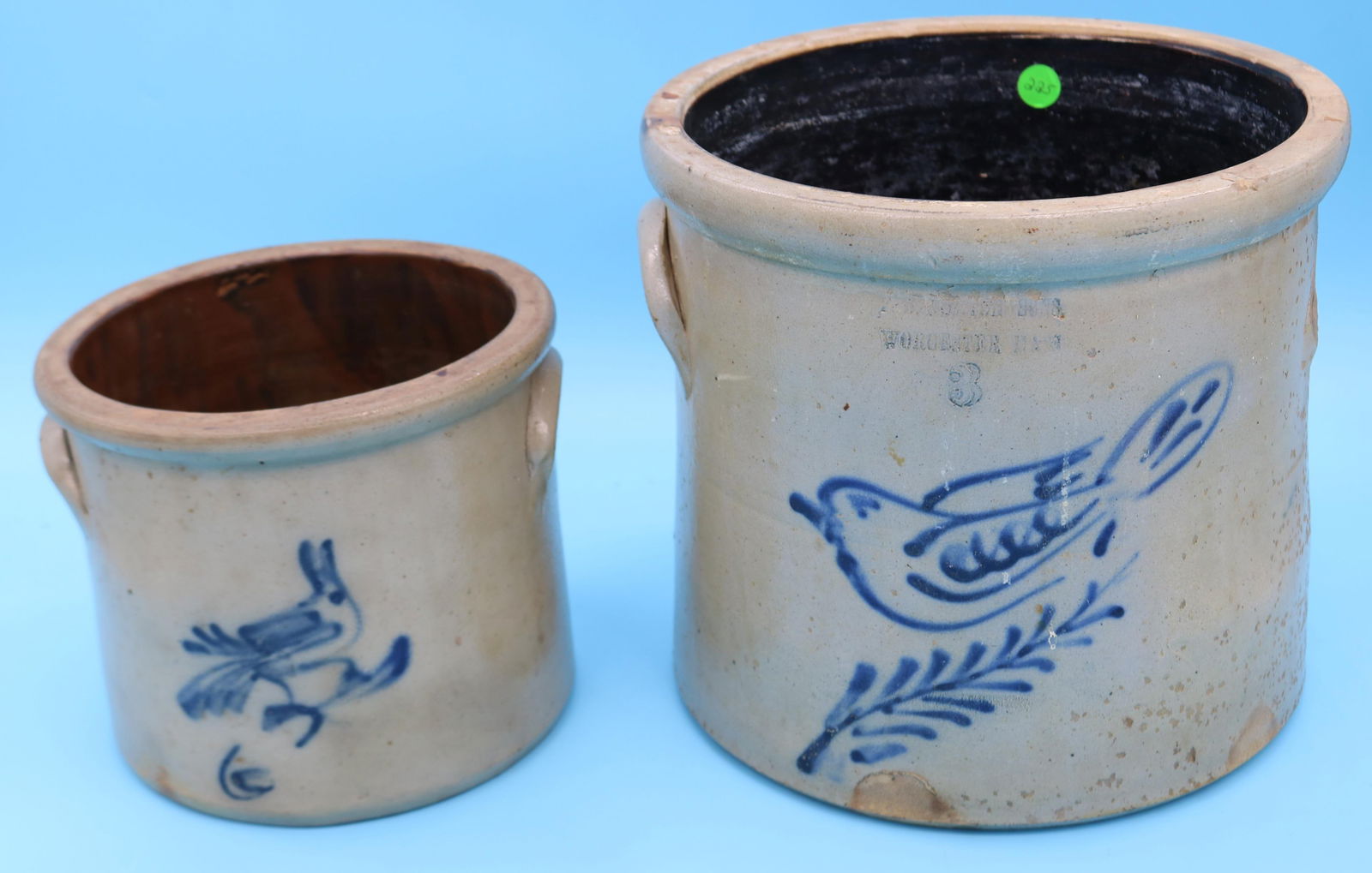 TWO 19TH C. STONEWARE CROCK WITH BLUE BIRD
