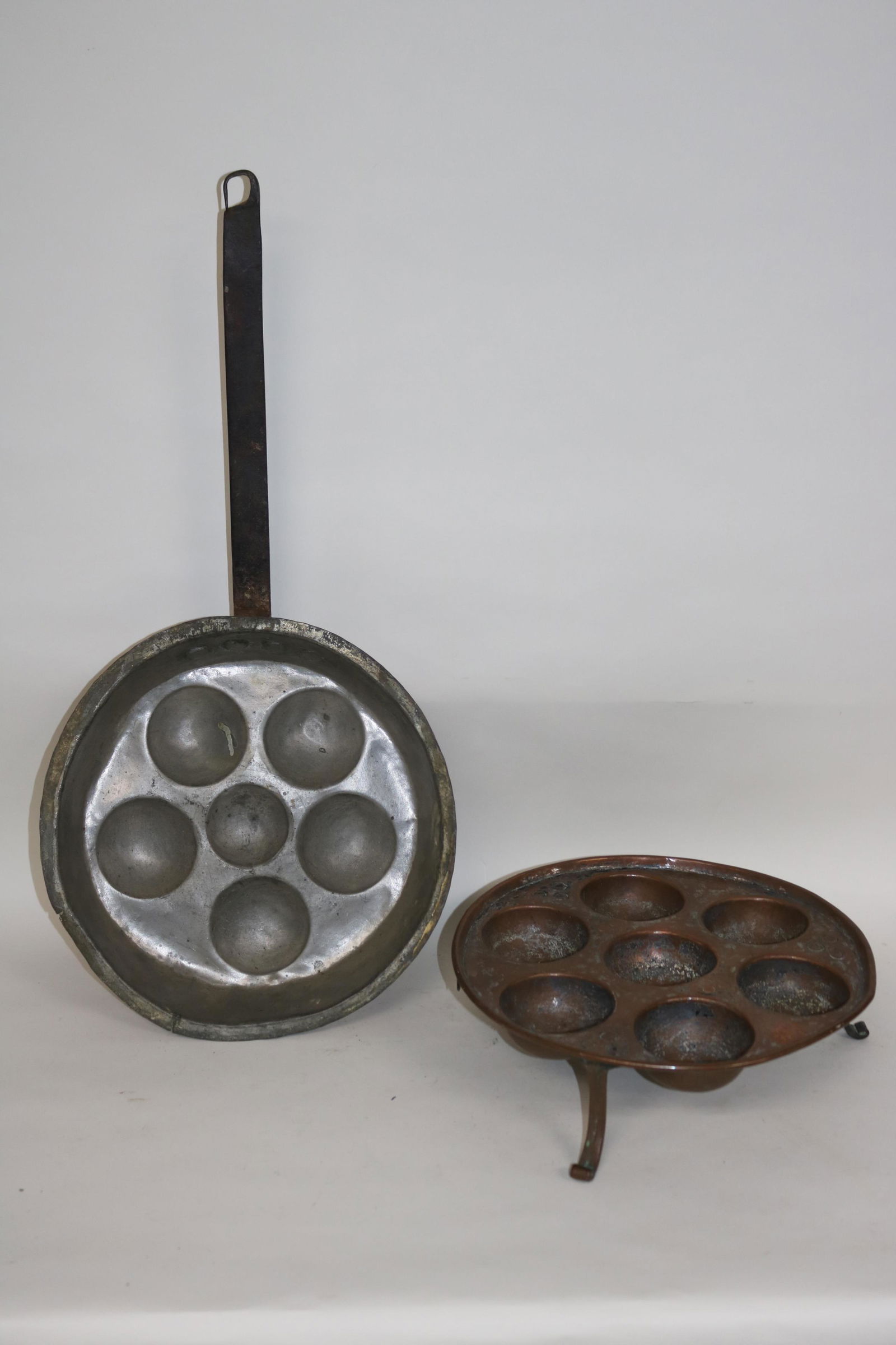 TWO 19TH CENTURY HAMMERED COPPER EGG PANS