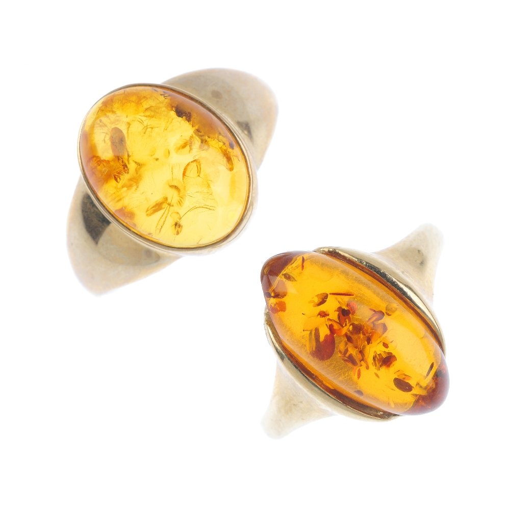 Two 9ct gold amber single-stone rings. Each designed as