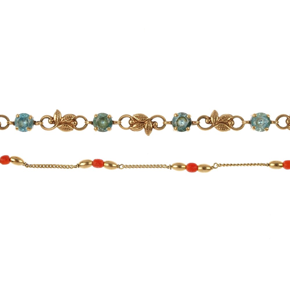 SoldTwo 9ct gold gem-set bracelets. The first, a series ofTwo 9ct gold gem-set bracelets. The first, a series of oval-shape sapphires and single-cut diamond accents with infinity loop spacers, the second, a series of circular-shape garnets, with stylised curSee Sold Price