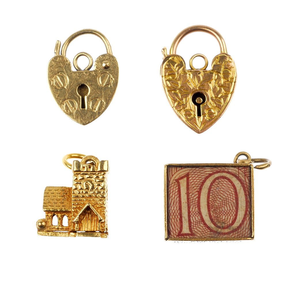 Two 9ct gold padlock clasps and two charms.