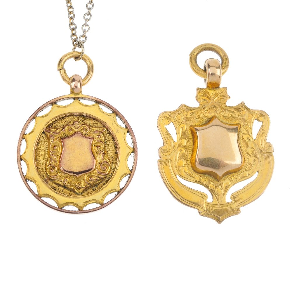 SoldTwo early 20th century 9ct gold gem-set pendants. ToTwo early 20th century 9ct gold gem-set pendants. To include a circular-shape aquamarine and split pearl pendant, with a split pearl and paste pendant, each suspended from a chain. Length of pendantsSee Sold Price