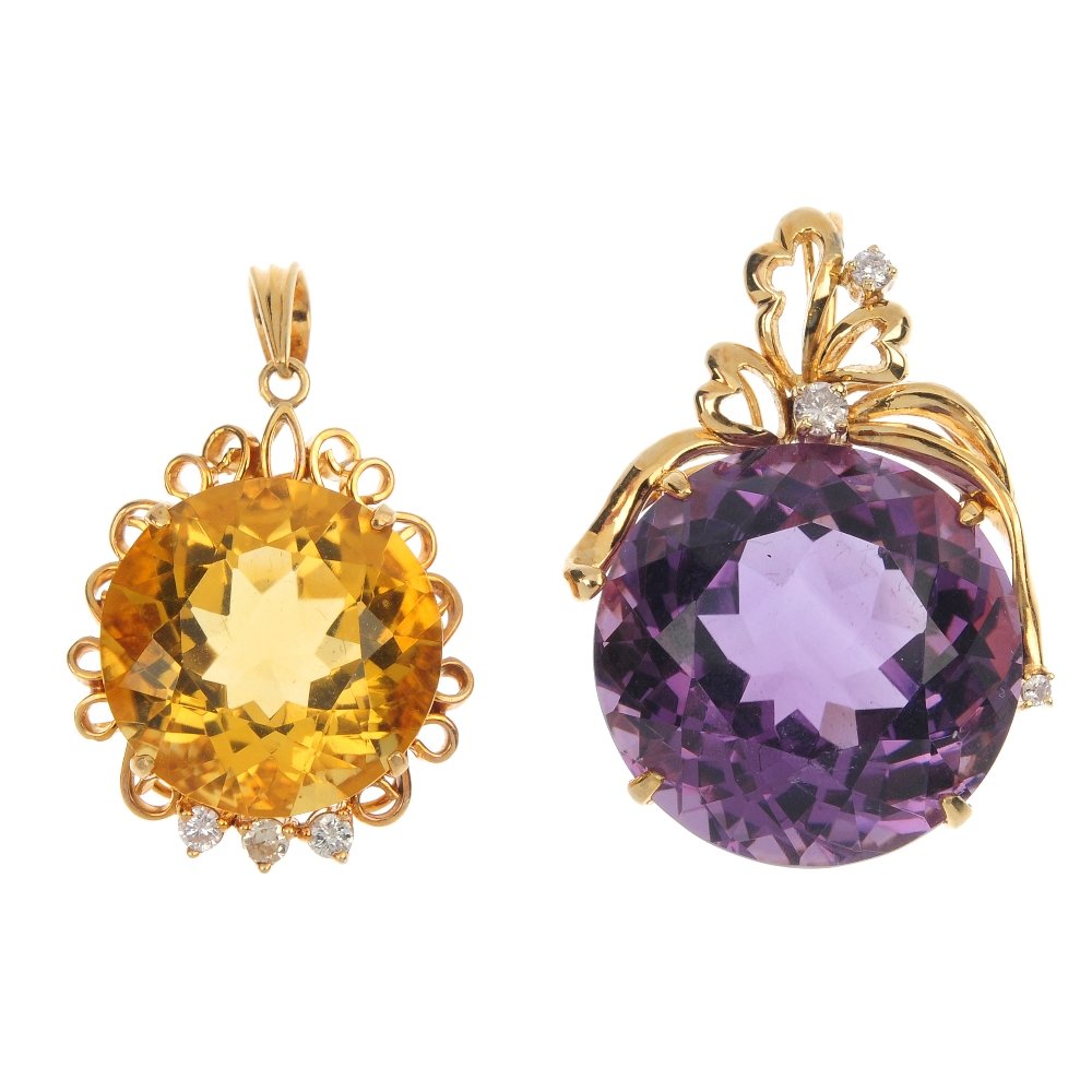 SoldTwo 9ct gold Edwardian gem-set pendants. To include anTwo 9ct gold Edwardian gem-set pendants. To include an openwork panel with circular-shape amethyst highlights and a vari-shape amethyst and split pearl foliate detail pendant. AF. Lengths 3.9 and 4cmsSee Sold Price