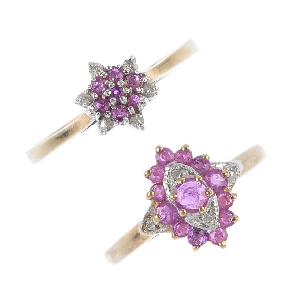 Two 9ct gold ruby and diamond cluster rings. The first