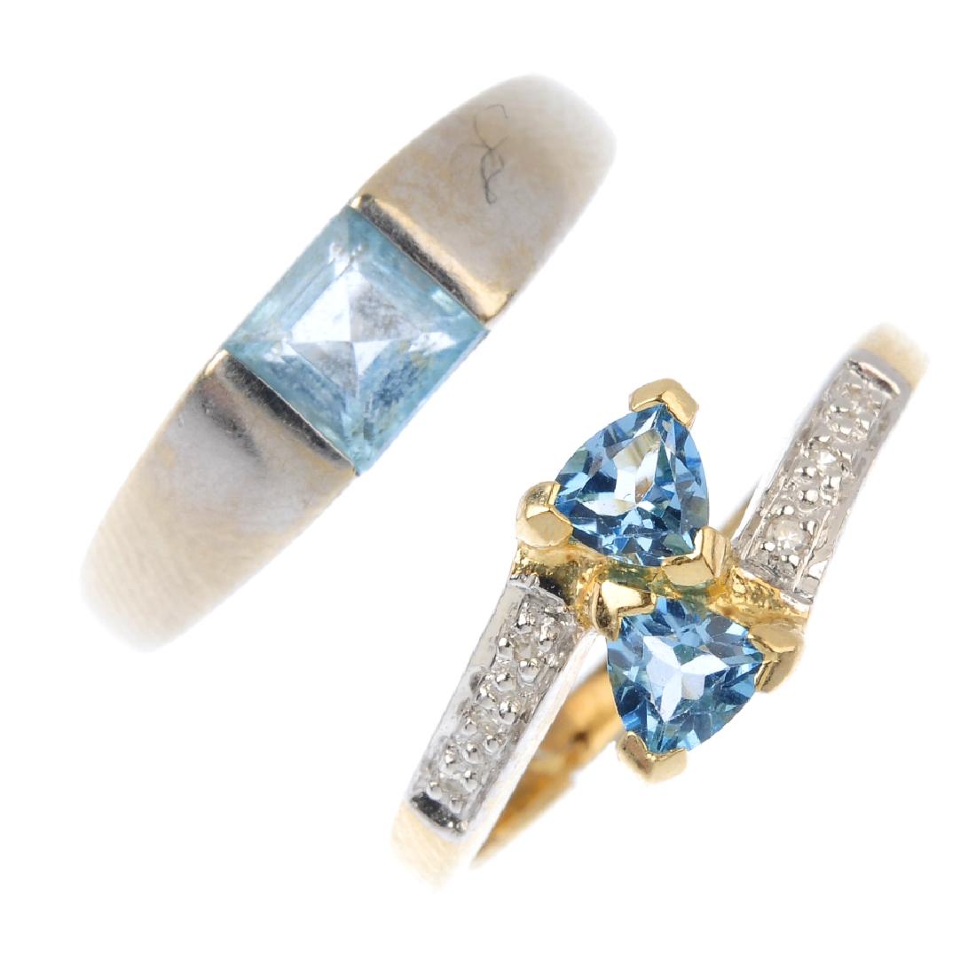 Two 9ct gold topaz rings. To include a triangular-shape