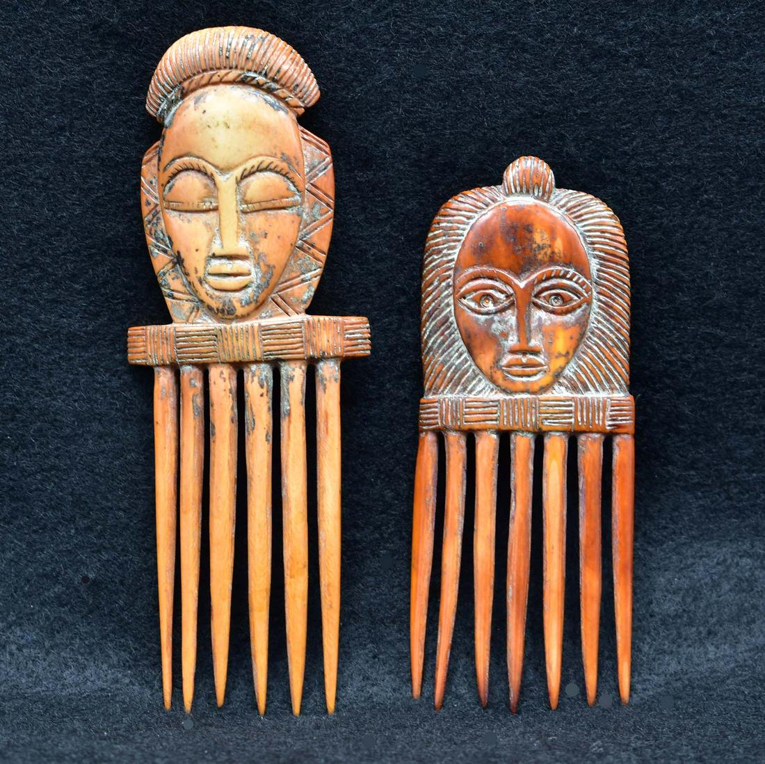 TWO AFRICAN STAINED HAIR COMBS