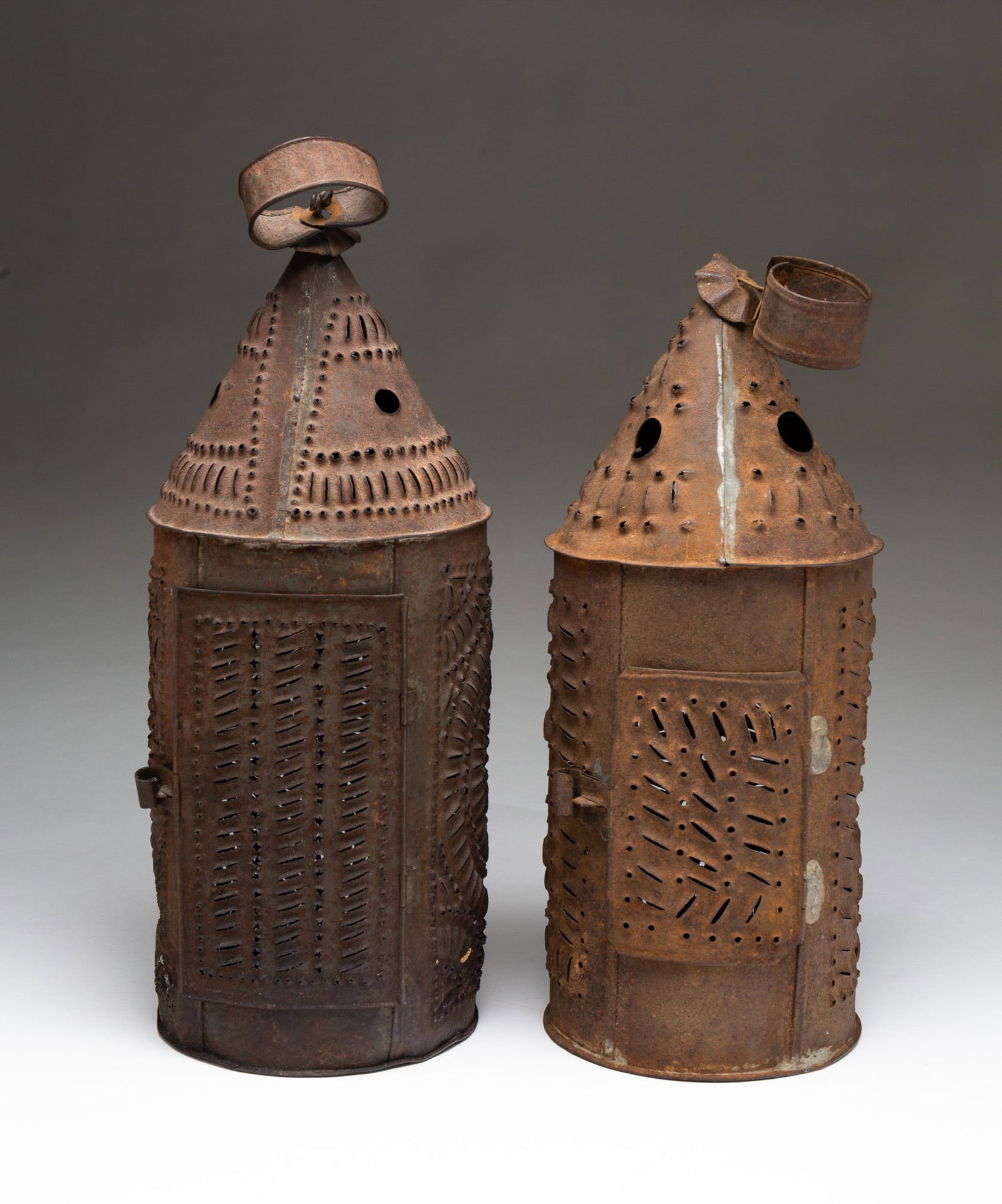 TWO AMERICAN PUNCHED TIN CANDLE LANTERNS.