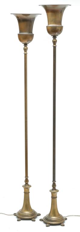 SoldTwo Torchiere Floor LampsNOT ELIGIBLE FOR IN-HOUSE SHIPPING. Brass 10-1/2" diameter X 57" high. Silver 10-1/2" diameter X 61" high. Untested. Both missing shades.See Sold Price