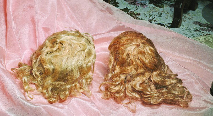 TWO ANTIQUE BLONDE WIGS WITH BANGS. Sized for