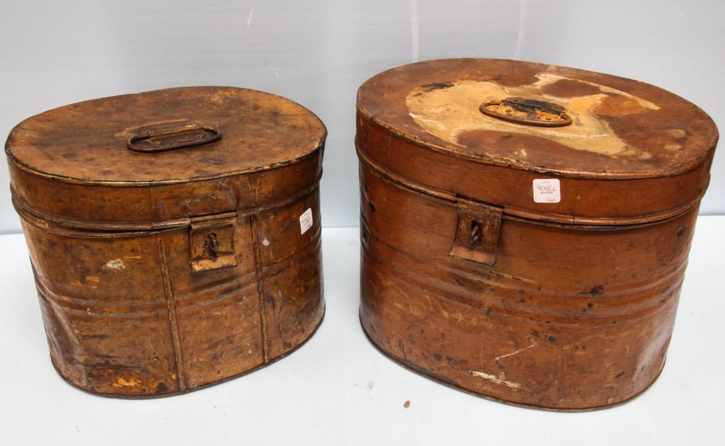 Sold(2 Pc) Antique Wood And Leather Hat BoxesDESCRIPTION: Two antique hat boxes for travel: one smaller and composed of wood and brass, one larger and composed of wood and parchment leather and accented with studs. CIRCA: Early to mid-20th CentuSee Sold Price