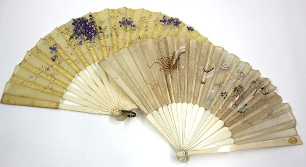 Sold(2) Vintage hand painted fansTwo vintage Asian themed fans, hand painted on silk and paper with bamboo ribs, (1) 8.5"l, and (1) 7"l.See Sold Price
