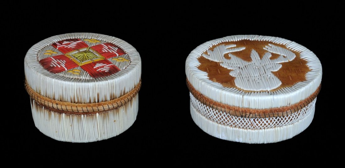 Two Birch Bark and Quill Lidded Baskets; Geometric