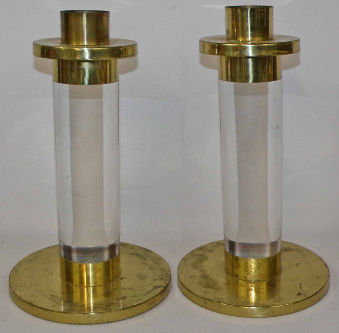TWO BRASS AND LUCITE CANDLE STICKS