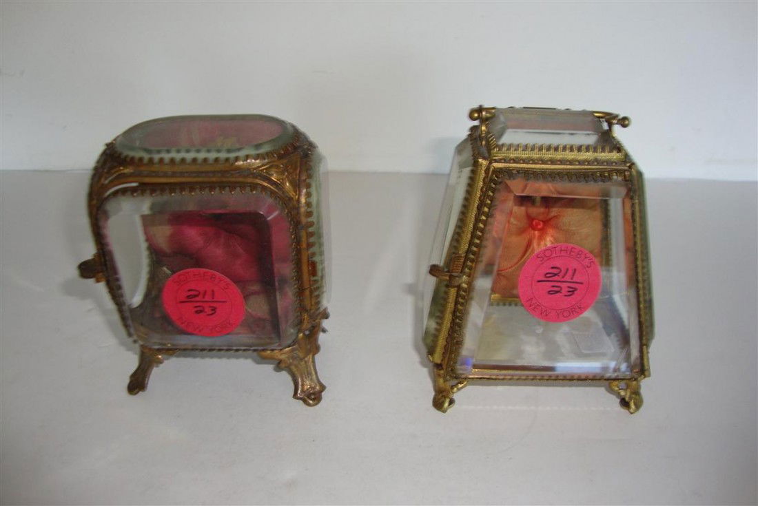 TWO BRONZE AND BEVELED GLASS WATCH BOXES