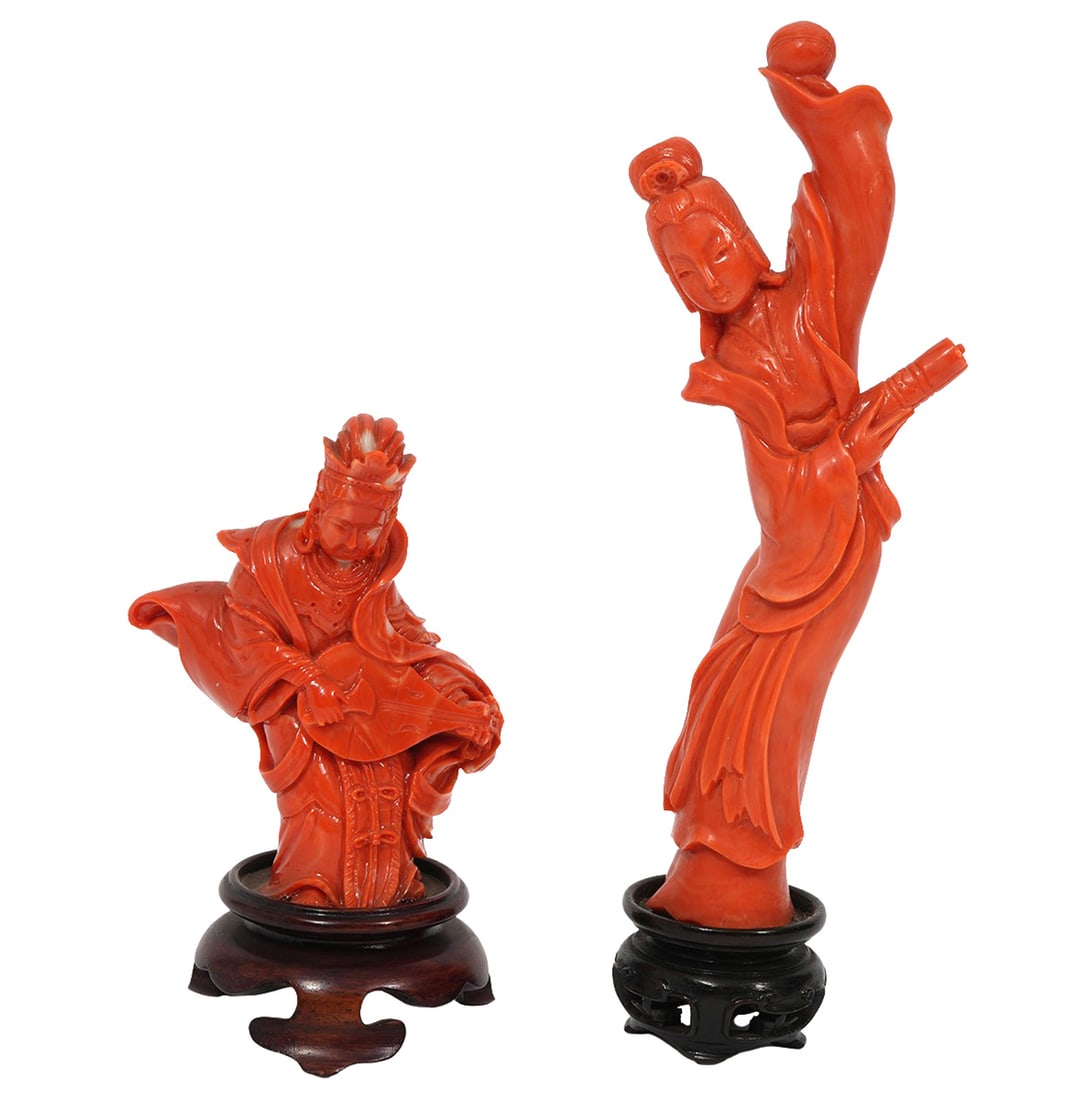 Two Carved Chinese Coral Figures
