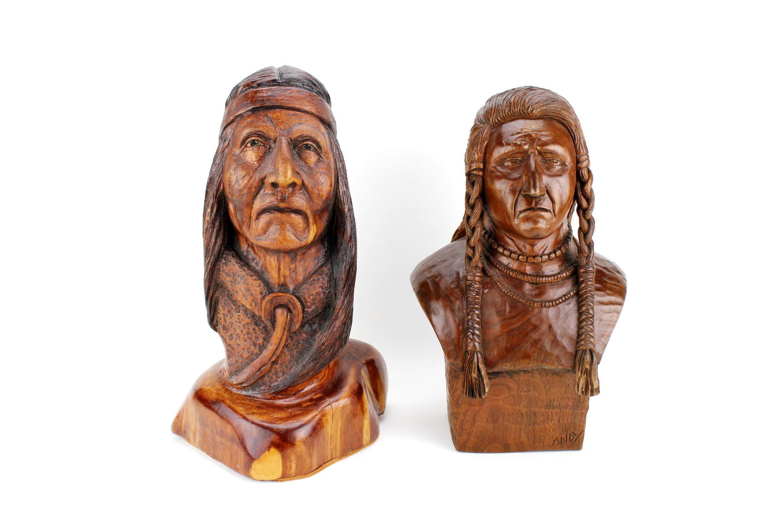 SoldTWO CARVED NATIVE AMERICAN FIGURE BUSTSThe larger one signed "DM, 09" and Andy in 14 in. H..Please see pictures for detailed conditions.See Sold Price