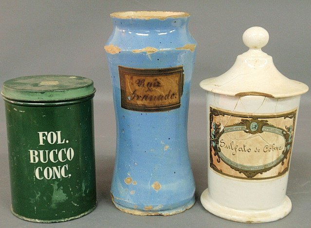 Two ceramic apothecary jars, 19th c., and a green tin e