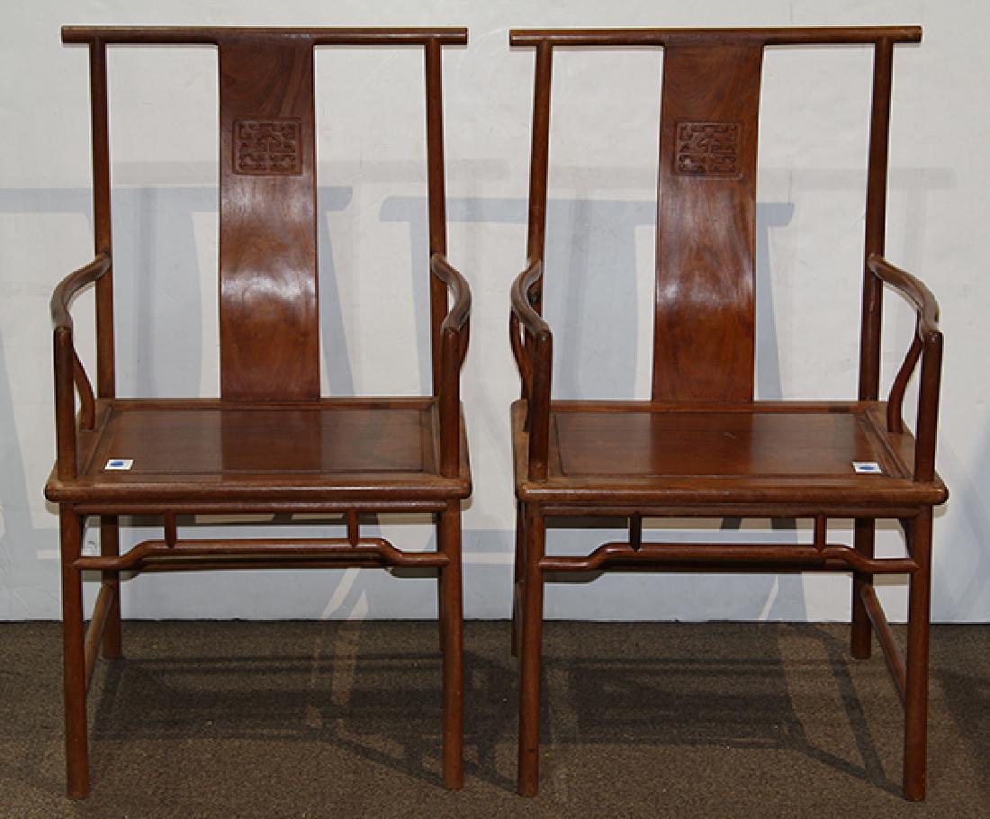SoldPair of Chinese Hongmu ArmchairsPair of Chinese Hongmu Armchairs, 20th century, the two carved chairs with scrolling ruyi clouds on the arms and backs, h. 38-1/4".See Sold Price