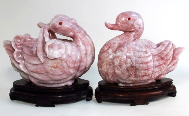 TWO CHINESE CARVED ROSE QUARTZ DUCKS