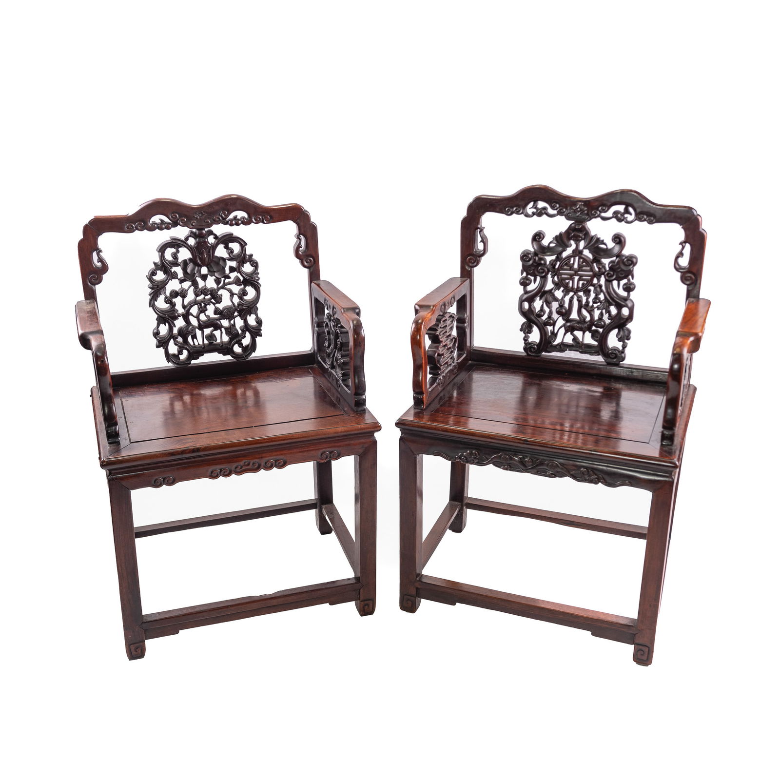 SoldPair 19th C. Chinese ArmchairsPair of late 19th century Chinese hardwood armchairs with hand-carved cloud motifs on backrests. [36" H x 24 1/2" W x 17" D].See Sold Price