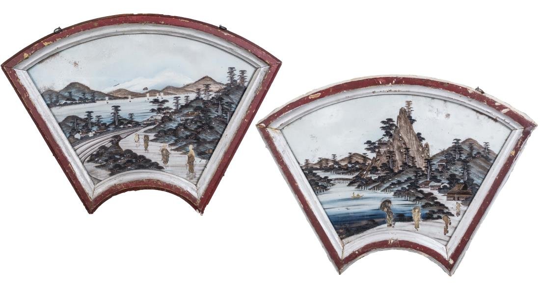 Two Chinese Painted Fan Shaped Panels