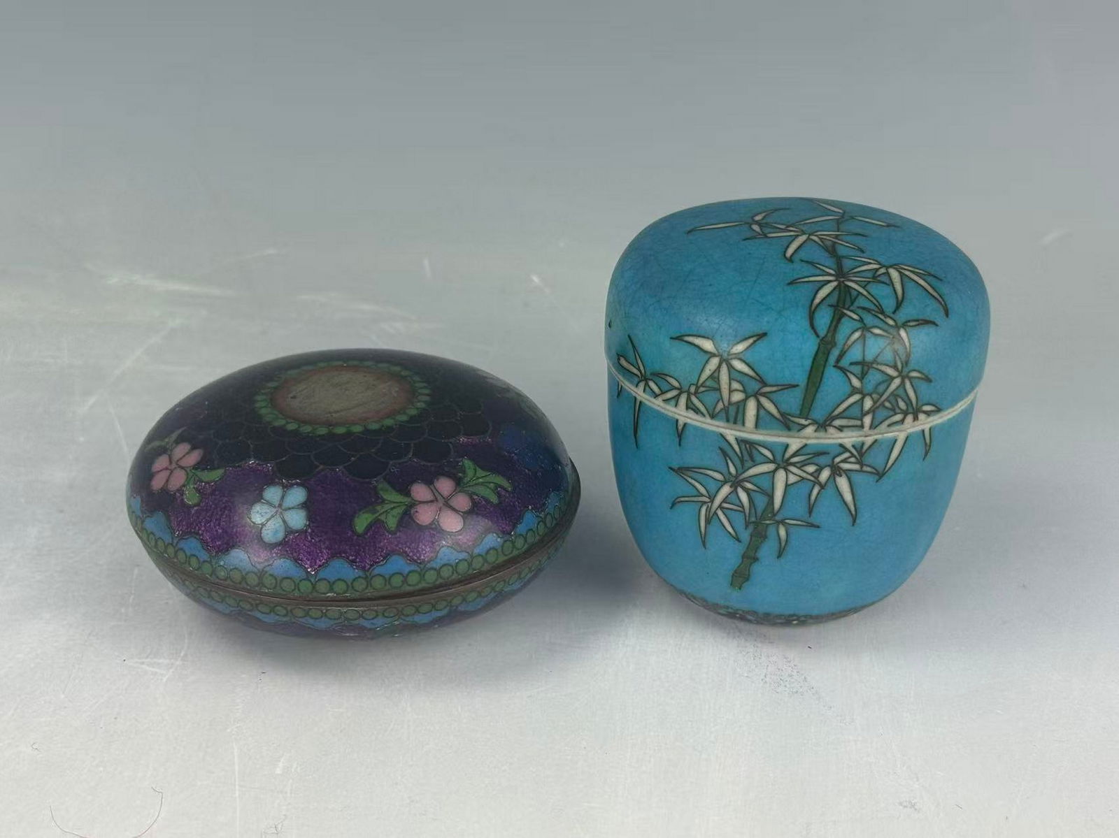 SoldTwo cloisonne boxes. China. 19th century. Decoration of flowers on a turquoise ground and on a blackTwo cloisonne boxes. China. 19th century. Decoration of flowers on a turquoise ground and on a black ground. 6in and 5in diameters.See Sold Price