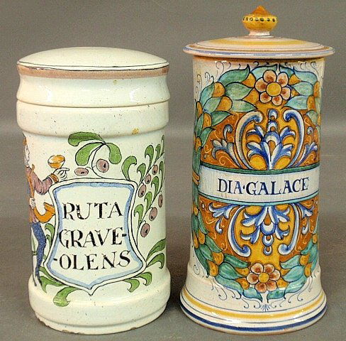 Two colorful faience apothecary jars with covers, large