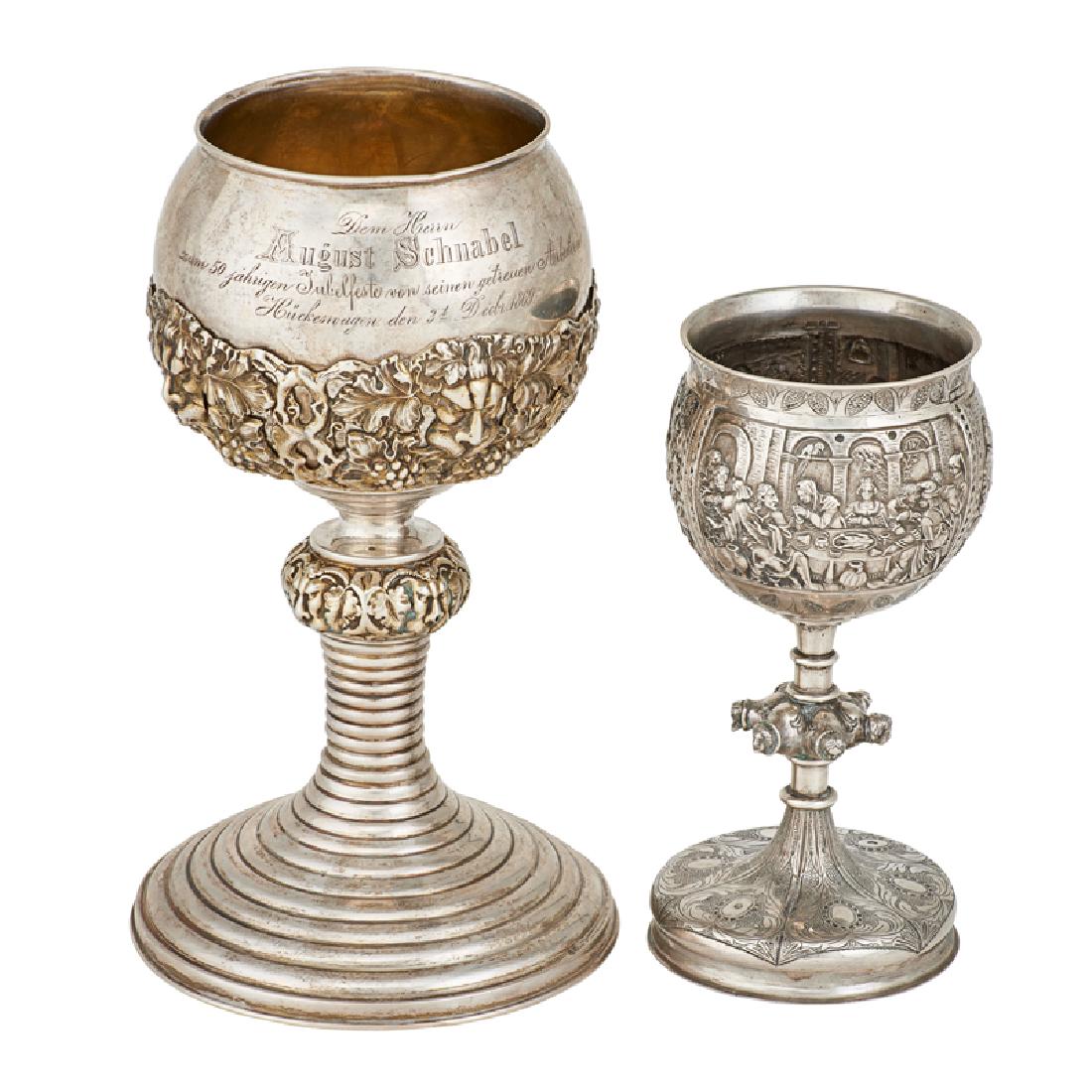 A composed lot of four religious silver and silver-plated brass church objectsFeb 24, 2026Three Silver Plated Stemmed Goblets5 hrs LeftANTIQUE SILVER GOBLETS WITH RELIEF PORTRAIT MEDALLIONSFeb 22, 2026Pair of Silver Stemmed Figural CupsFeb 28, 2026Two English silver mounted coconut cups, 19th century5 days LeftPair of Silverplated Candlesticks by Gorham1 day LeftCollection Chinese silver cups and trophies4 days LeftTwo American Coin Silver Cups4 hrs LeftANTIQUE SWEDISH SILVER FOOTED BEAKER CHALICE EWB MARKMar 07, 2026A pair of Victorian silver goblets Frederick Elkington, Birmingham 1876 (2)Shreve & Co Sterling Silver Urn Vases Set of 2 1910Feb 26, 20262 S. Kirk & Son Sterling Bowls & J S Macdonald VaseFeb 26, 2026A pair of Old Sheffield Plate wine coolers apparently unmarked, circa 1830's(2) English silver Rangoon sports trophies4 days LeftLondon 1809 by Duncan Urquhart and Naphtali Hart A pair of George III sterling silver goblets3 days LeftA pair of Sheffield silver plated footed wine coolersMar 03, 2026