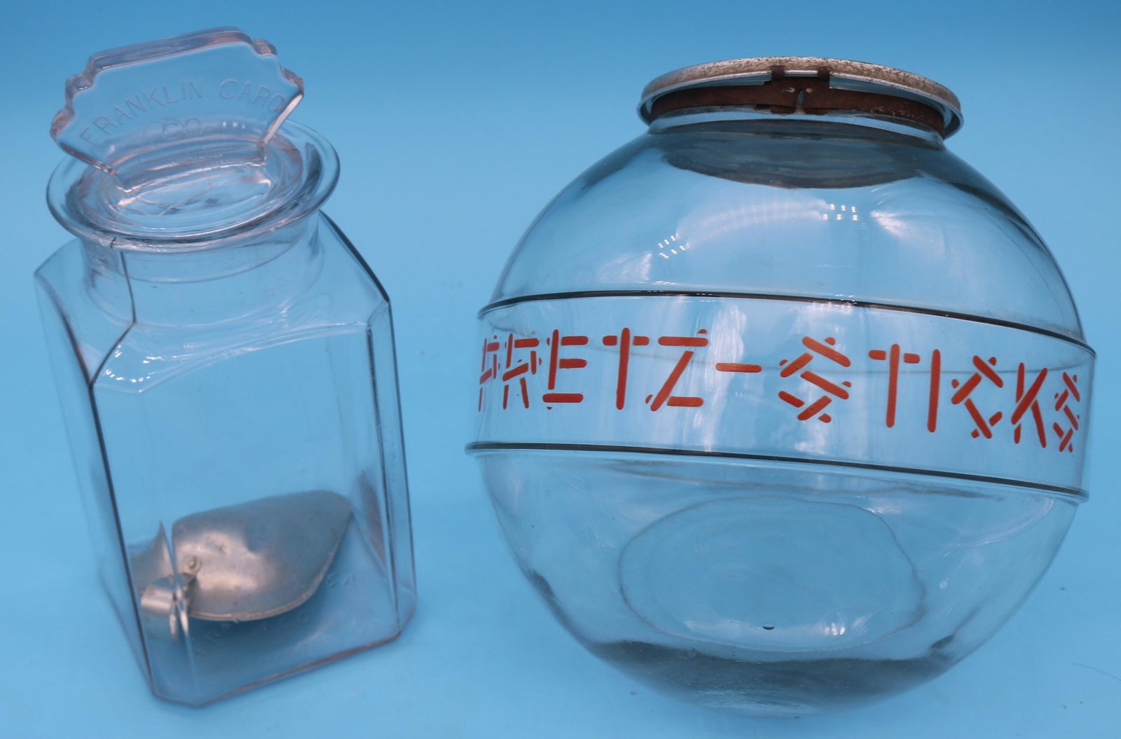 TWO COUNTRY STORE GLASS JARS, TO INCLUDE PRETZEL