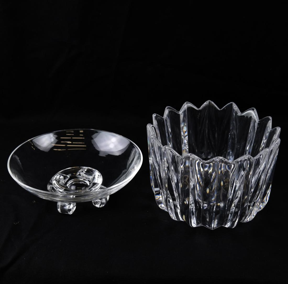 SoldTwo Crystal Vessels, Orrefors and SteubenComprises: 1.) Signed Orrefors reeded scallop-form bowl. Marked "Orrefors" and "J J XNY 15 (?)" 2.) Footed bowl signed "Steuben." Dimensions: Orrefors - 7.5" H x 5See Sold Price